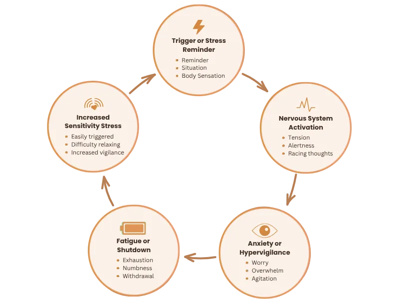 This is because trauma can shape patterns within the nervous system and the body’s stress responses. When these post-traumatic patterns remain active, the body may continue responding as if danger is still present — through anxiety, hypervigilance, emotional overwhelm, or shutdown.
