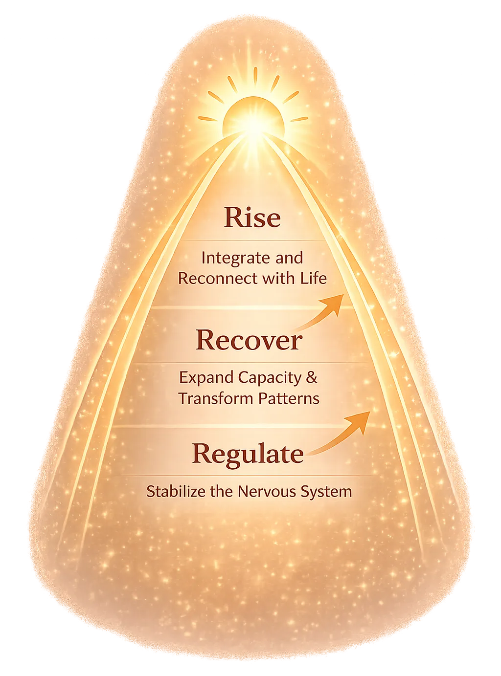 The iRise Program guides participants through a structured progression designed to stabilize the nervous system, expand internal capacity, and support deeper integration and renewed engagement with life.
